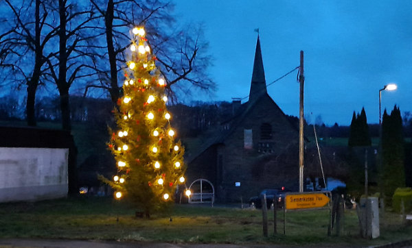 Erster Advent, das traditionelle Aufstellen des Weihnachtsbaums im Ort, Ketten einhängen, Schleifen anbringen, alles befestigen und danach ein Nachbarschaftstreffen mit Glühwein, Bier und Bockwurst bei Beate und Stefan vom Hofe – so läutete die Dorfgemeinschaft Kempershöhe die Adventszeit ein. Der diesjährige Baum kommt aus Dürhölzen und ist mit sparsamen LED-Lichterketten ausgestattet. Unterstützung beim Aufrichten des Baums gab es wieder von Udo Däinghaus aus Scharde, der mit dem Teleskoplader im Einsatz war.