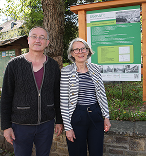 [Jutta Ramackers und Johannes Klüser vor der Übersichtstafel auf dem Fritz-Wingen-Platz.]