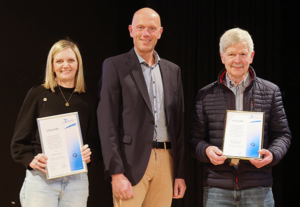 [Im Namen des Kreissportbundes Oberberg überreichte Tim Bubenzer (Mitte) Ehrennadeln an Janina Binot und Hans Joachim Rosenbaum.]