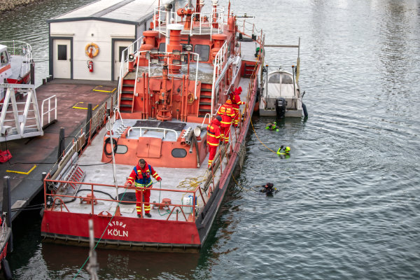Der Übungstag begann mit dem Sammeln der Einheiten am Fühlinger See, wo der Wasserrettungszug um 9 Uhr in den Bereitstellungsraum einrückte. Bis zum späten Nachmittag wurden verschiedene Lagen auf Kölner Stadtgebiet abgearbeitet. Ein Höhepunkt der Übung war ein außergewöhnlicher Einsatz der oberbergischen Einsatztaucher: Sie gingen im Deutzer Hafen direkt vom Feuerlöschboot „Hydra“ der Feuerwehr Köln aus ins Wasser. „Der Tauchgang diente der Erprobung von Einsatztaktiken in Hafenbereichen und unter beengten, realitätsnahen Bedingungen“, hieß es in einer Mitteilung.