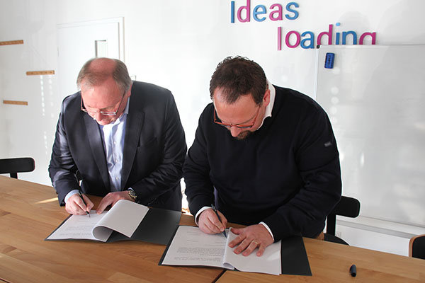 [Jetzt ist es amtlich: Thorsten Konzelmann (li.) als Chef der SPD Oberberg und Thomas Jüngst als stellvertretender Vorsitzender der CDU Oberberg setzen ihre Unterschriften unter den Koalitionsvertrag.]