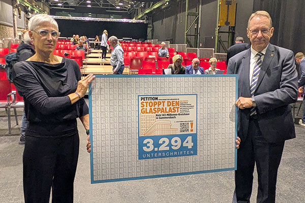 Noch bevor die Sitzung von Landrat Jochen Hagt vor den Kreistagsmitgliedern und rund 30 Besuchern eröffnet wurde, übergab die Grünen-Landratskandidatin Bernadette Reinery-Hausmann dem scheidenden Kreischef die Unterschriften ihrer Petition „gegen den Glaspalast“ (Foto). 3.294 Unterschriften waren online zusammengekommen, die sich gegen das 143-Millionen-Euro-Projekt ausgesprochen hätten. Bei dieser Zahl wurden alle in der anfänglichen Planung beabsichtigten Bauabschnitte berücksichtigt. Beschlossen vom Kreistag wurde zunächst lediglich ein Bauabschnitt, der 92 Millionen Euro kosten soll. Eine Umsetzung der weiteren Abschnitte war beim Kreis zuletzt kein Thema. In der Schublade liegen die Planungen aber freilich trotzdem.