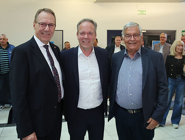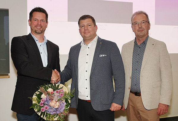 [René Kauffmann (m.) gratulierte Jan Gutowski (li.) zum Wahlsieg; er wird der Nachfolger von Rüdiger Gennies (re.).]