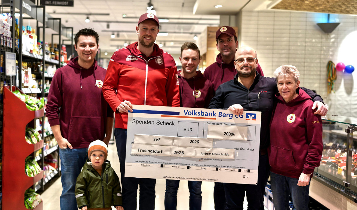 Der SV Frielingsdorf hat am Samstag einen Scheck über 2.000 Euro von Rewe-Marktleiter Fathi Celik überreicht bekommen. Die Spende setzt sich aus den Einnahmen verschiedener Aktionen aus der Vergangenheit zusammen. Dazu gehört die Nikolauswette von Bürgermeister Sven Engelmann und Marktinhaber Andreas Kleinschmidt, bei der der Förderverein Glühwein und andere Heißgetränke verkauft hat. Hinzu kommt der Rewe-Mettwurst-Stand auf dem Weihnachtsmarkt in Frielingsdorf und nicht zuletzt dem Wetteinsatz von Fathi Celik bei der verlorenen Bundesliga-Tippspiel-Wette gegen Sebastian Feldhoff.