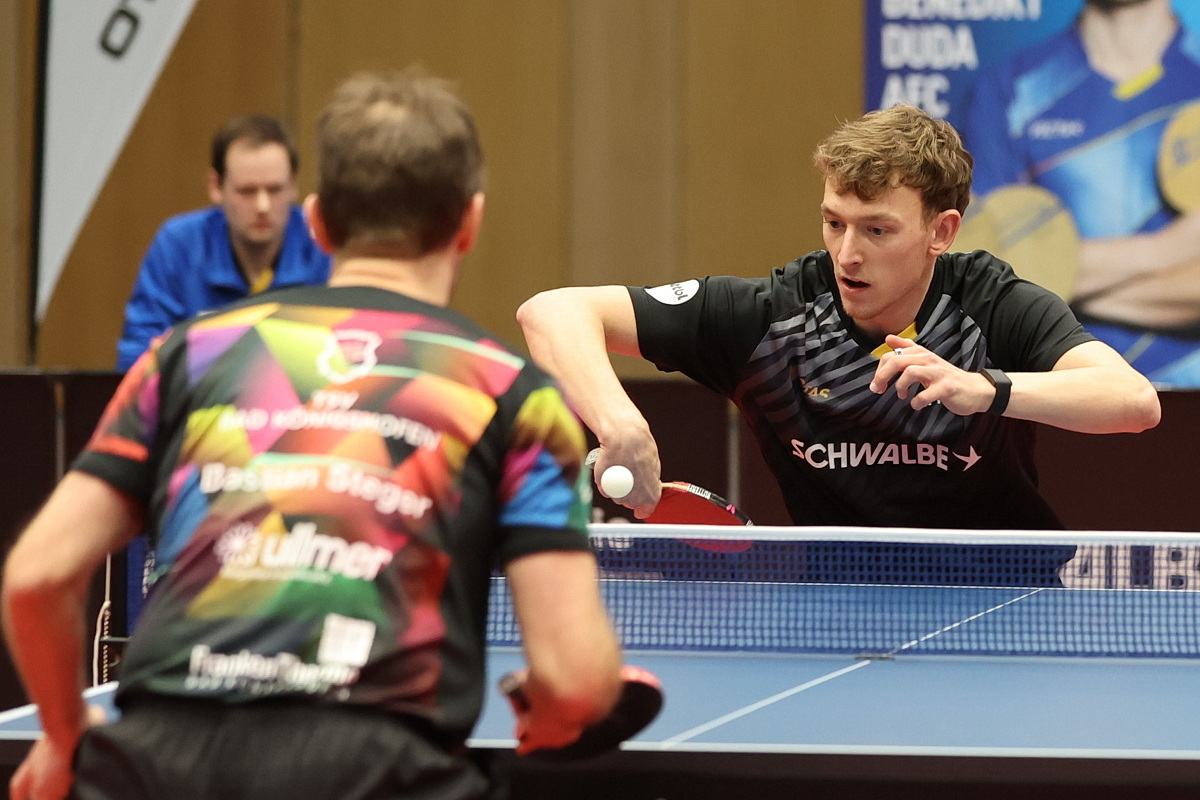 Zunächst gerieten die Bergneustädter allerdings in Rückstand. Nach langer Zeit lief Adrien Rassenfosse, zuletzt auch angeschlagen, mal wieder in einem Einzel für das Schwalbe-Team auf. Gegen Ruwen Filius (37) bewies der Belgier allerdings einmal mehr, dass der routinierte Abwehrspezialist nicht zu seinen Lieblingsgegnern gehört und verlor mit 0:3, wobei er nur im dritten Satz wirklich auf Augenhöhe agierte. Im Anschluss sorgte Duda gegen den Dänen Jonathan Groth, der aus einer Verletzung kam, aber mit einem 3:0-Erfolg für den schnellen 1:1-Ausgleich. Vorentscheidenden Charakter hatte danach das Duell der Spieler an Position drei. Hier rang Leo de Nodrest Fangbo Meng mit seiner starken Rückhand mit 3:1 nieder, sodass Duda den Sieg im Anschluss in der Hand hatte.