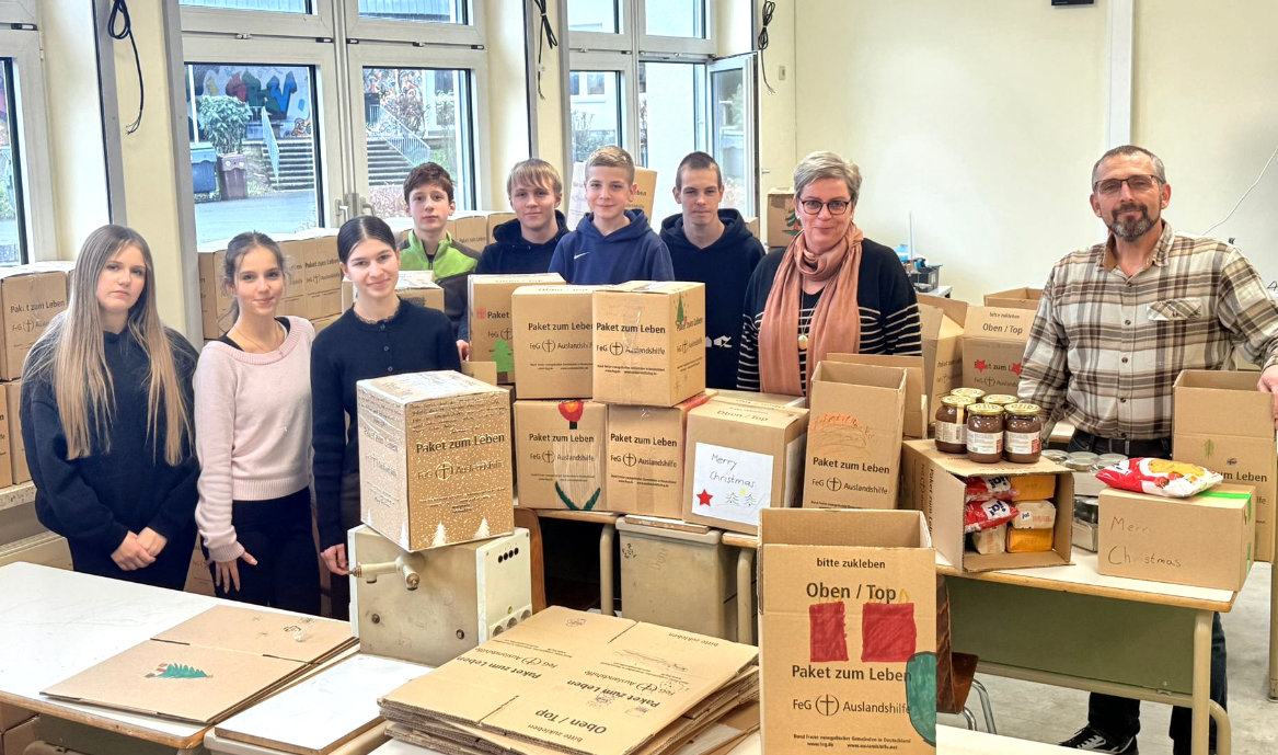 Unter dem Motto „Packen statt Pauken“ wurde der alte Physikraum der Realschule, der Anfang 2026 umfassend renoviert und modernisiert wird, zur weihnachtlichen Packstation umfunktioniert. Die Schüler packten insgesamt 100 Pakete, die im Vorfeld weihnachtlich dekoriert worden waren. In Zusammenarbeit mit der FeG-Auslandshilfe hat Religionslehrer Peter Hildebrandt die Hilfsaktion organisiert.