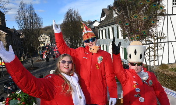 lw; 15.02.2026, 20:40 UhrEngelskirchen – Ründerother Karnevalsverein feierte mit tausenden Menschen auf den Straßen – Prinzenpaar hatte seine Kinder als Verstärkung dabei.