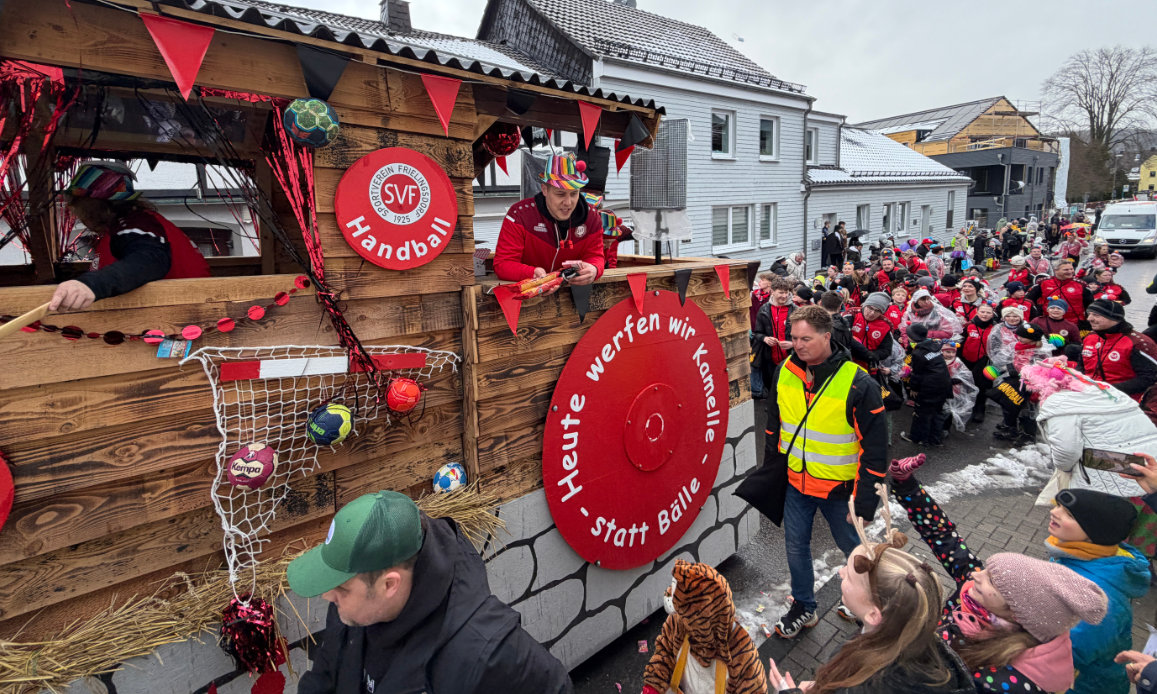 ls; 16.02.2026, 14:10 UhrLindlar - Trotz Teilnehmerrückgang und bescheidenem Wetter feierten die Jecken ausgiebig beim Kinderzug durch Frielingsdorf.