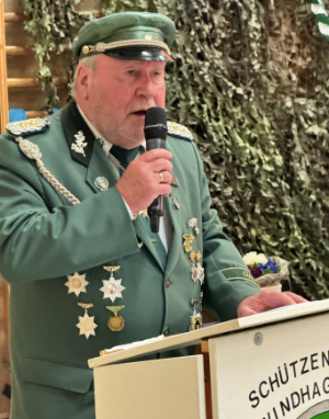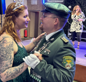 beim Festkommers am Samstagabend vom Vorsitzenden Carsten Rothe (Onkel des Königs, Foto links) im Beisein von Gastvereinsvertretern, Offiziellen und der Bevölkerung in der Festhalle an der Grundschule feierlich gekrönt. Rothe ehrte außerdem langjährige Vereinsmitglieder. Offiziershauptmann Jens Rothe erhielt die Bronzene Verdienstmedaille des Vereins und der Präsident des Oberbergischen Schützenbundes (OSB) Thomas Ufer verlieh Janin Martel die kleine Jugendverdienstnadel und seiner Ehefrau Anette Ufer die Silberne OSB-Verdienstnadel (Foto unten). Die Familie Ufer ist im Windhagener Schützenverein ebenfalls tief verwurzelt.