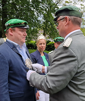 [Noch vor Ort wurde Christoph Bauer vom Vorsitzenden der Gummersbacher Grünröcke Markus Brand in Amt und Würden gesetzt.]