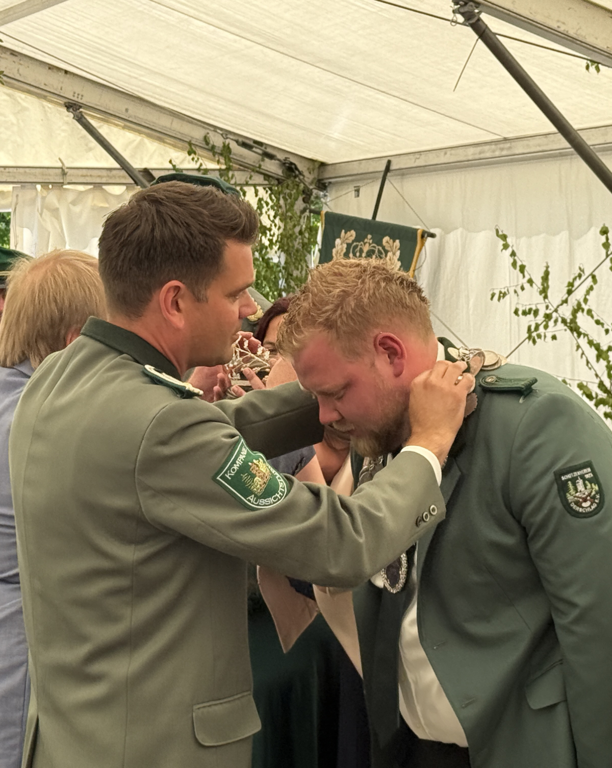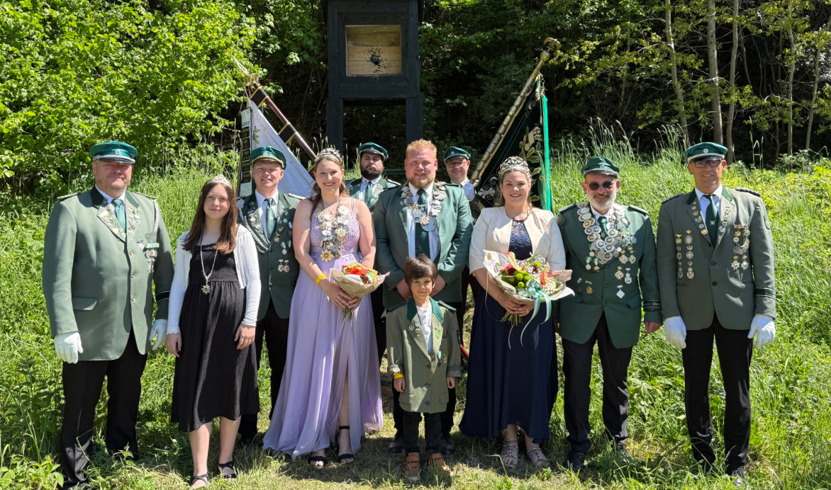 Während der neue König das Derschlager Vereinsleben bislang nur als Zaungast kannte, ist Vivian Seeber schon länger bei den Grünröcken und war bereits Prinzessin. Eine echte Wiederholungstäterin in dieser Funktion ist Lea Risken (24), die zwar im vergangenen Jahr satzungsgemäß pausieren musste, ihren Triumph von 2023 aber wiederholte und den Prinzenvogel von der Stange holte, dieses Mal mit dem 132. Schuss. Zuvor hatte sie bereits den Titel der Maikönigin mit dem 169. Treffer geholt. Ihr zur Seite steht Lebensgefährte Marius Fastenrodt als Prinzgemahl. Er übernimmt dieses Amt bereits zum dritten Mal in Folge, ohne bislang selbst das begehrte Federvieh von der Stange geholt zu haben. „Ich habe noch ein paar Jahre“, scherzte der 25-Jährige. In Derschlag darf man bis zur Altersgrenze von 30 Jahren auf den Prinzenvogel anlegen.