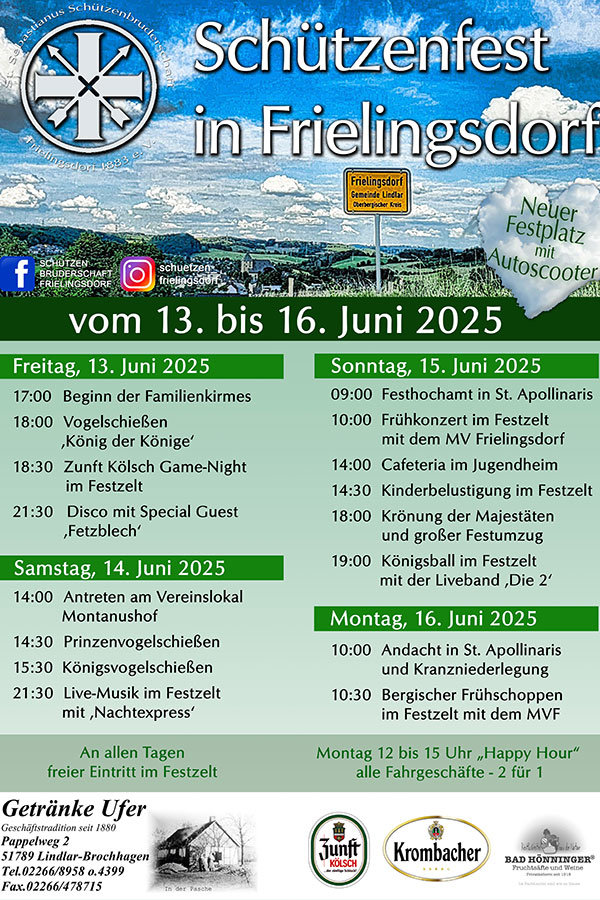 Die Sankt Sebastianus Schützenbruderschaft Frielingsdorf 1883 lädt von Freitag bis Montag, 13. bis 16. Juni, zum diesjährigen Schützenfest ein. Am Freitag ab 18 Uhr fällt laut Mitteilung der Startschuss mit dem Vogelschießen zum König der Könige. Anschließend startet ab 18:30 Uhr die "Zunft Kölsch Game-Night" im Festzelt. Im Anschluss wird mit der Band „Fetzblech“ und anschließendem DJ gefeiert.