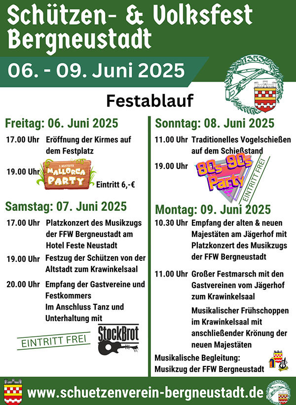 Am Samstag werden alle Schützen am Hotel „Feste Neustadt“ in der Altstadt antreten. Dafür wird die Hauptstraße gesperrt und von 17 Uhr an mit dem Musikzug der Freiwilligen Feuerwehr Bergneustadt gefeiert. Gegen 18:45 Uhr ziehen die Schützen gemeinsam mit Bürgermeister Matthias Thul sowie den Landsknechten und Marketenderinnen Richtung Krawinkelsaal. Dort startet um 20 Uhr der Festkommers mit den Gastvereinen. Gegen 21 Uhr betritt die Band "Stockbrot" die Bühne.