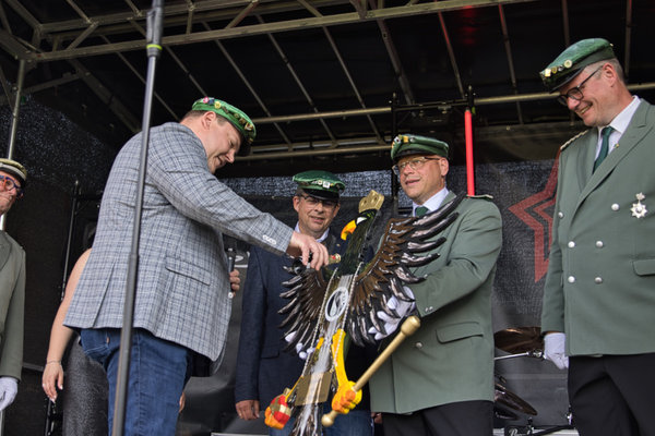 [Schützenkönig Christoph taufte den Königsvogel auf Holzadler von Hardt-Hanfgarten.]