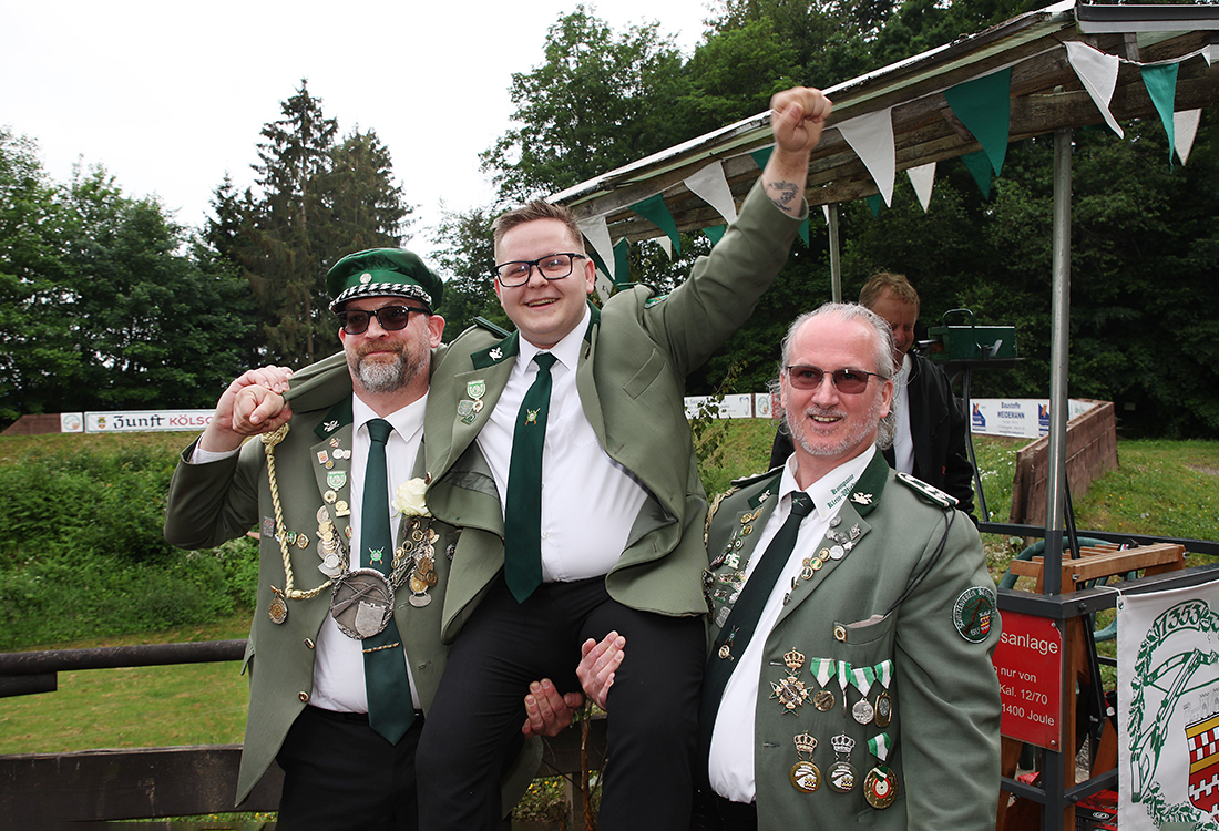 war es Kämke, der mit dem 76. Schuss die letzten Überbleibsel von der Stange fegte. Der 23-jährige stammt aus der Nähe des Stadtwalds und ist ehrenamtlich bei der Feuerwehr-Einheit Kleinwiedenest tätig. Das Kaiserschießen wurde per Los entschieden. Nach dem 106. Schuss hatten sich die beiden verbliebenen Kandidaten Maik Kron und Maik Bonner darauf geeinigt. „Wir hätten bestimmt noch 100 Schuss mehr gebraucht, um den zähen Vogel herunterzuholen“, so der neue Regent Kron. Bürgermeister Matthias Thul hatte beide Pinnchen ziehen lassen.