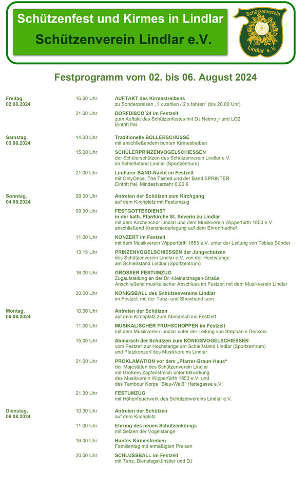 Der Schützenverein Lindlar feiert sein Fest in diesem Jahr vom 2. bis 6. August im Festzelt neben dem REWE-Markt in Lindlar. Los geht es am Freitag mit der „Dorfdisco“. Es gibt Musik von DJ Heimo jr. Der erste zu erlegende Vogel ist der Schülerprinzenvogel. Um 15 Uhr wird dieser am Schießstand geschossen.Am Samstag Abend spielen OnlyOnce, The Tasted und Sprinter, drei Bands aus der Lindlarer Umgebung, im Festzelt.