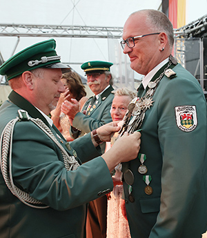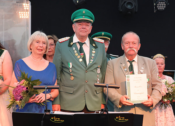 Eine besondere Ehrung erfuhr Gerd Raffelsiefer. Ihm wurde der „Kleine Verdienstorden“ verliehen. Zu Ehrenmitgliedern wurden Dietmar Hardenacke und Thomas Roos durch den Vorsitzenden und Oberst Erhard Simon ernannt. Joachim und Margot Rohrbeck feierten als Jubelpaar ihr 25-jähriges Königsjubiläum.