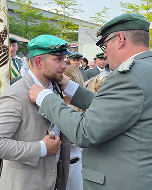 [Vor dem "32 Süd" wurde Sören Blaue vom Vorsitzenden der Gummersbacher Grünröcke Markus Brand (r.) in Amt und Würden gesetzt.]