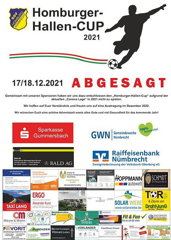 Der SSV Homburg-Nümbrecht hat sich gemeinsam mit seinen Sponsoren dazu entschlossen, den für das Wochenende 17./18.12.2021 in der GWN-Arena Nümbrecht geplanten „Homburger-Hallen-Cup“ aufgrund der aktuellen „Corona-Lage“ nicht zu spielen.