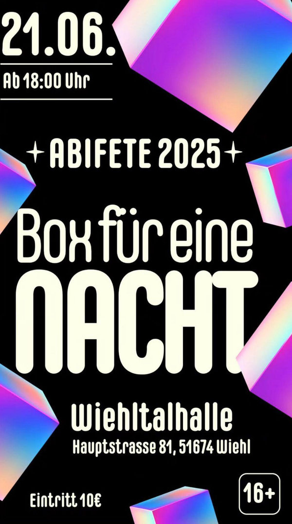 WIEHL Abi-Party in Wiehl TEILEN Red; 17.06.2025, 14:53 Uhr Wiehl - Die Stufe 12 des Dietrich-Bonhoeffer-Gymnasium in Wiehl veranstaltet am Samstag, 21. Juni, ihre Abifete - Es gibt eine Abendkasse. WERBUNG