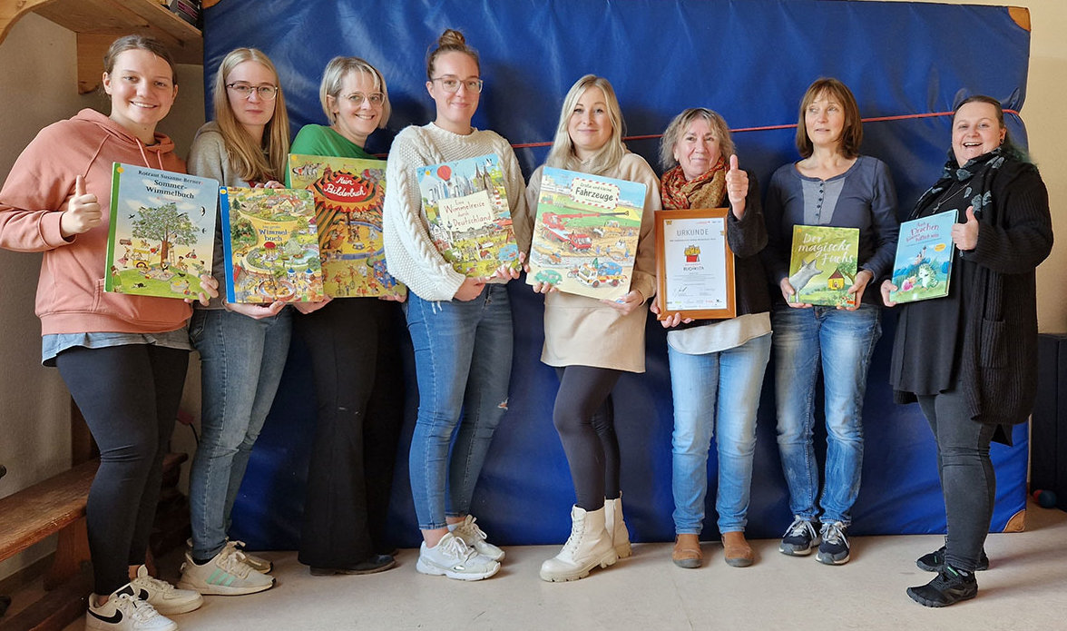 Einrichtungsleitung Carmen Oeder und ihr Kita-Team sind stolz auf die Auszeichnung: „Zu unserem Konzept gehört das regelmäßige Vorlesen in den Gruppen, aber auch viele weitere Angebote rund um das Bilderbuch. Bespielsweise nutzen wir einen Vorlesekoffer, besuchen die Bücherei in Wiehl, nehmen jedes Jahr am bundesweiten Vorlesetag teil und jede Woche besucht uns ein Vorlesepate." Darüber hinaus gebe es eine Theatergruppe in der Kita und eine eigene Bücherei mit einem Bestand von mehr als 700 Bilderbüchern und Geschichten.