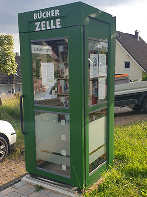 [Fotos: Dorfgemeinschaft Büttinghausen --- Eine ausrangierte Telefonzelle aus Berlin dient im Dorf nun als Bücherzelle.]