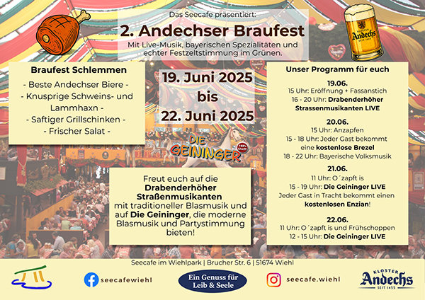 Nach dem Auftakt im vergangenen Jahr lädt das Seecafé in Wiehlpark auch in diesem Jahr wieder zum Andechser Braufest ein - mit bayerischer Gemütlichkeit, regionalen Spezialitäten und Live-Musik im Festzelt direkt am See. Im Mittelpunkt stehen bayerische Schmankerl wie knusprige Schweins- und Lammhaxn. Fehlen darf natürlich nicht das bekannte Bier. Es gibt tägliche Live-Auftritte. Beim traditionellen Festanstich am 19. Juni werden die Drabenderhöher Stadtmusikanten auftreten. Am 21. und 22. Juni sorgt die Band „Die Geininger“ mit moderner Blasmusik für Festzelt-Feeling. Zusätzliche Aktionen wie kostenlose Brezeln für alle Gäste (am 20. Juni) oder ein Gratis-Enzian für Trachtenträger (am 21. Juni) runden das Programm ab. Der Eintritt ist an allen Tagen frei.
