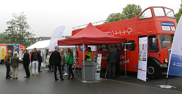 Wiehl - Gesundheitschecks und Informationen zum Thema Schlagfanfall gab es am Montag in Wiehl – Rund um einen roten Doppeldeckerbus klärten die Akteure der Schlaganfall-Initiative Oberberg über Symptome, Behandlung und Prävention auf.