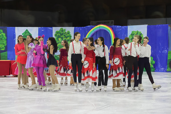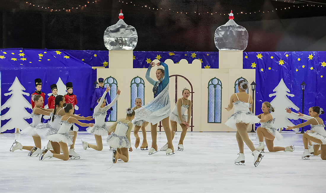 Die aufwendig gestaltete Kulisse (Monika Bürmann) aus Zauberwald, Schloss und Melodys Zuhause wurde belebt durch rund 140 kleine und große Kufenkünstler in hinreißenden Verkleidungen. Auf der weißen Bühne tummelten sich putzmuntere Schneemänner und Schneeflocken, standen Zinnsoldaten vor der Adjudantin (Matilda Pfeifer) stramm, segelten Schmetterlinge und Bienen über sorgsam gewässerte Blumenwiesen, bestachen die Soli der jungen Königin (Lilli Reier) und Minnie Mouse (Lilian von Eyb) oder tanzten sympathische Kaffeetassen in Begleitung abgefahrener Cup-Cakes. Ein imposantes, optisches Highlight setzte der Auftritt der zehn Flügelwesen, mit überdimensional großen, goldenen Schwingen.