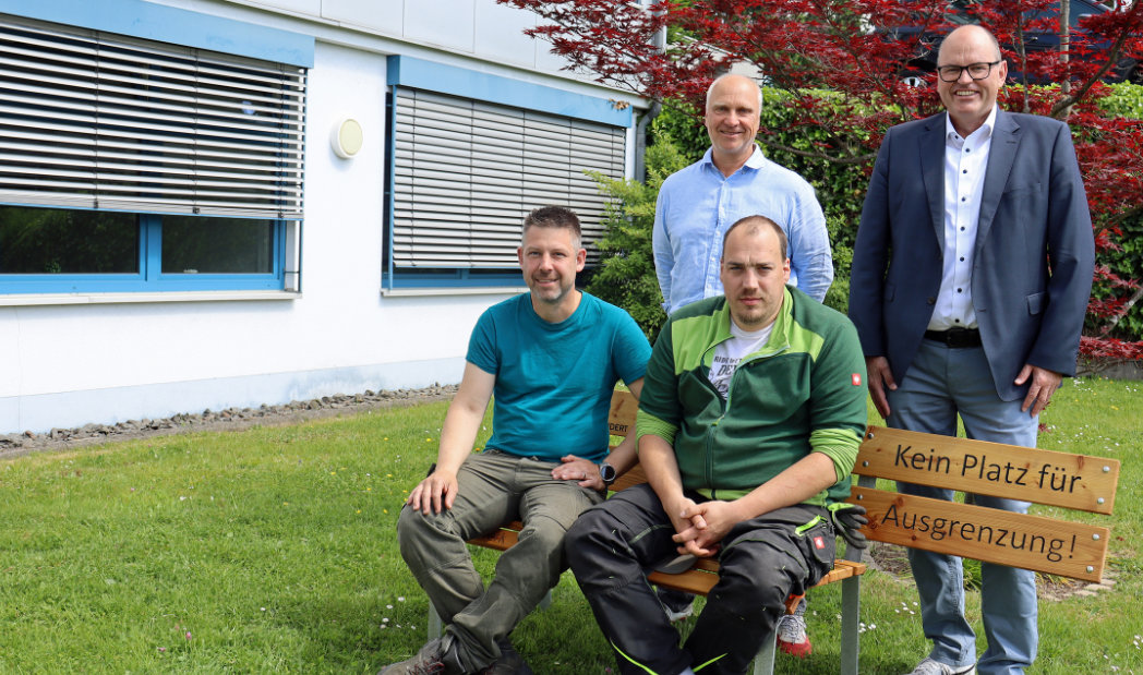 SHO-Geschäftsführer Jens Kämper und Ulrich Pflitsch, Vorstandsvorsitzender von Lebenspfade Oberberg e.V., begrüßten Cashella nun persönlich im Team. Dazu wählten sie mit der Bank „Kein Platz gegen Ausgrenzung“ einen besonderen Ort. Während eine Bank am Treff.Punkt Inklusion des Projekts „Wiehl enthindert“ steht, steht die andere vor der Zentralen Verwaltung des Vereins und seiner Firmen BWO, HBW und SHO.