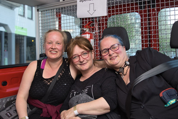 [Drei Kneipenbummlerinnen im Feuerwehr-Taxi auf dem Weg zur nächsten Location.]
