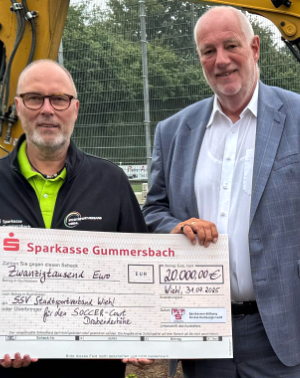 [Der Vorsitzende des Stadtsportverbands Wiehl, Hartmut Livrée (li.), nimmt den Spendenscheck aus den Händen von Frank Grebe, der auch als Vorstandsvorsitzender der Sparkassen-Stiftung für das Homburger Land fungiert, dankbar entgegen.]