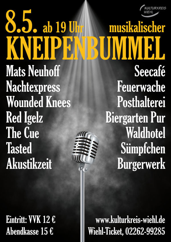 Am Mittwoch, 8. Mai (Tag vor Christi Himmelfahrt), kann man wieder musikalisch durch die Wiehler Kneipen bummeln. Durch den zeitlich gestaffelten Beginn der Veranstaltung und die meist fußläufig zu erreichenden unterschiedlichen Kneipen, Räumlichkeiten und Biergärten im Stadtzentrum können die Besucher mit einem Kneipenpass viele verschiedene Bands sehen. Für weitere Strecken ist bis 22 Uhr das „Musiktaxi“ der Feuerwehr unterwegs.