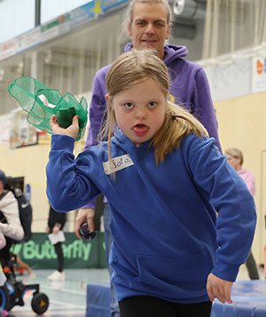 Nach dem quirligen Auftakt der „Pompösen“ startete dann der aktionsreiche Tag mit vielfältigen Sport- und Bewegungsangeboten, für den zwölf teilnehmende Organisationen und Vereine die Sporthalle in einen Turn- und Trainingspark verwandelt hatten. Über Schulen, Förderschulen, Sportvereine und Social Media waren Menschen jeden Alters, mit oder ohne Einschränkungen eingeladen worden, um Spaß am gemeinsam ausgeübten Sport und Freude im gemeinsamen Miteinander „am eigenen Leib“ zu erleben. „Wir möchten Teilhabe für alle verwirklichen und die Parallelwelten von Menschen mit und ohne Behinderung zusammenführen“, unterstrich Astrid Wollenweber, als Projektleitung