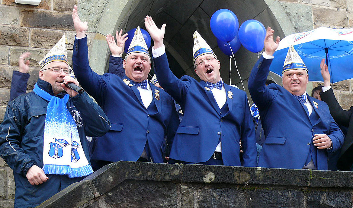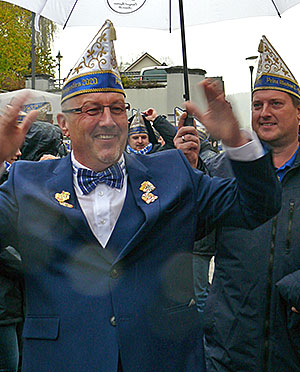 "Unsere Tanzgruppen brennen schon darauf uns zu zeigen, was sie einstudiert haben". Mit einem kurzen Rückblick auf die Höhepunkte der vergangenen Session bedankten sich Prinz Tobi, Bauer Flo und Jungfrau Marie für eine erlebnisreiche Zeit und wurden mit einem dreifach donnernden "Bielstein Kapaaf" in den Majestätsruhestand versetzt. Bei einsetzendem Regen und zu den Dudelsackklängen von "echte Fründe" annoncierte Präsi Becher das designierte KVB-Dreigestirn als "Schwergewichte" des Bielsteiner Karnevals, bevor sich das Trio, samt putzmunterem Schmölzchen, auf dem Balkon des alten Postamtes positionierte.