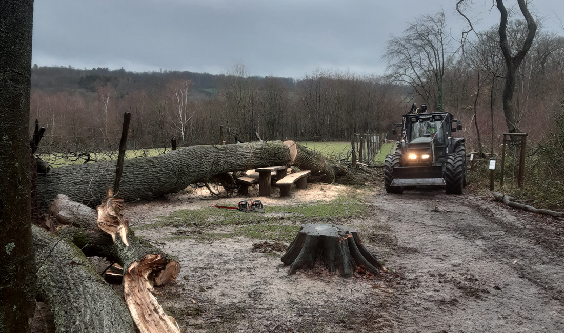 Ein knappes Jahr ist vergangen, nachdem ein Sturm zwei Tage vor Weihnachten 2023 eine Eiche auf den Außenzaun des Dam-Muffelwildgeheges gelegt hat, die unter anderem die Picknickecke und ein Schild unter sich begrub. Seitdem hat sich im Wildpark Wiehl viel getan. Zunächst standen Aufräum- und Wiederherstellarbeiten an der genannten Stelle an. Anschließend wurde die im Herbst 23 gepflanzte Hecke ausgezäunt, damit das Rotwild die Fläche zum Äsen wieder betreten konnte, ohne die Heckensträucher und Bäume zu verbeißen. Die Pflanzen sind alle gut angegangen und werden in einigen Jahren die beiden Koppeln optisch voneinander trennen. Außerdem stellen sie für Kleinsäuger, Insekten und Vögel einen Lebensraum und eine Erweiterung des Futterangebots dar.