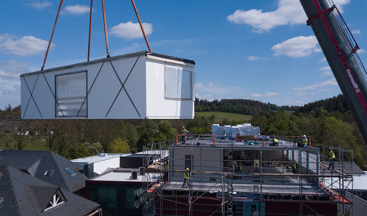 [Die neun zusätzlichen Module wurden in der ALHO Raumfabrik in Friesenhagen-Steeg vorgefertigt.]