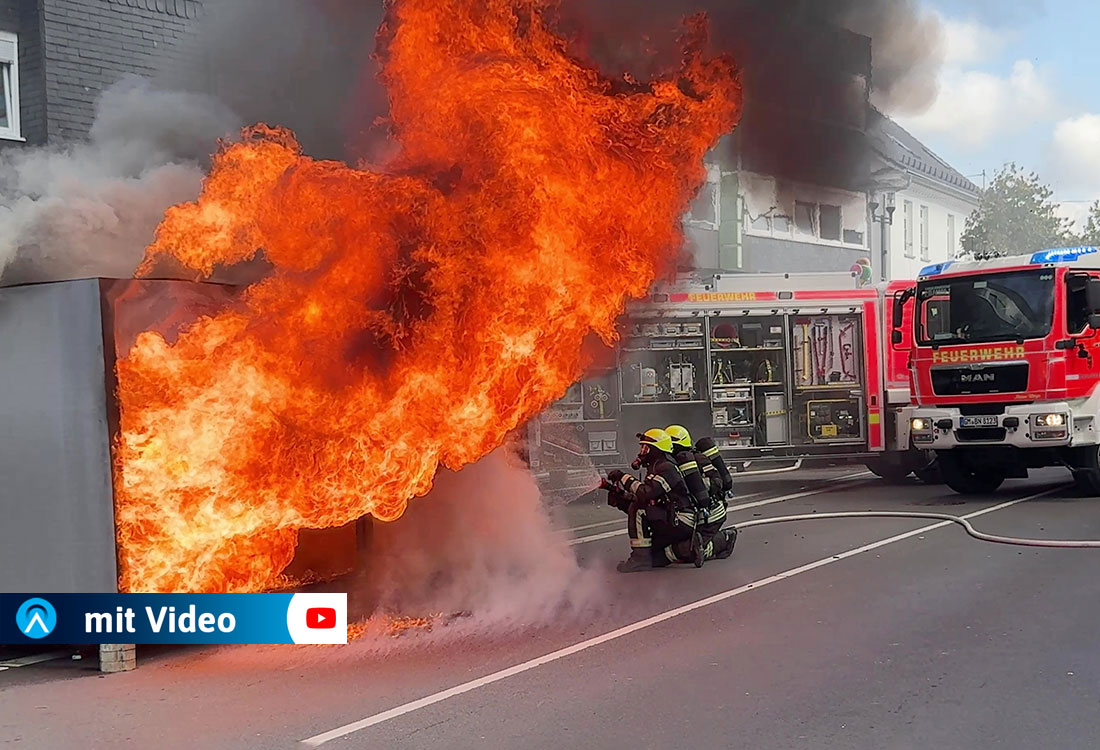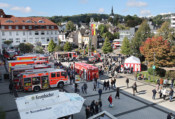 „Bitte kommen Sie schnell! In meinem Wohnzimmer brennt es!“ Der abgesetzte Notruf erklang laut über den Lautsprecher am Marktplatz in Bergneustadt. Hunderte Besucher verfolgten die Simulation eines Zimmerbrandes, dessen Feuer im Hintergrund gut sichtbar und durch die extreme Hitze hautnah spürbar war. Auch das Anrücken des Löschzuges und die Löschaktion beeindruckte die vielen Erwachsenen und Kinder.