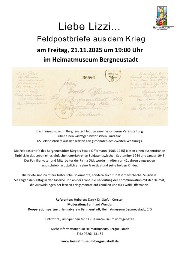 BERGNEUSTADT "Liebe Lizzi...": Feldpostbriefe aus dem Krieg TEILEN Red; 08.11.2025, 17:40 Uhr Bergneustadt - Veranstaltung im Heimatmuseum Bergneustadt am 21. November. WERBUNG
