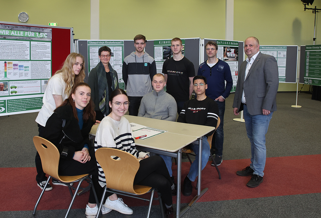 Erdkundelehrer Lars Schubert hat die Ausstellung organisiert und mit Schülern der Q2 vorbereitet. Gemeinsam mit Schulleiterin Monika Türpe, den beteiligten Lehrern, Bürgermeister Matthias Thul und dem Klimaschutzmanager der Stadt Bergneustadt, Carsten Eschenhorn, wurde die Ausstellung nun offiziell eröffnet.