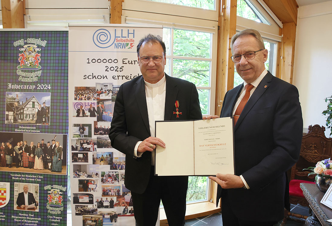 Bergneustadt – Schottischer Dudelsack, bewegende Geschichten und eine außergewöhnliche Feierstunde: Für sein jahrzehntelanges Engagement in der Leukämie- und Lymphom-Hilfe wurde dem Bergneustädter Michael Enders das Bundesverdienstkreuz verliehen.