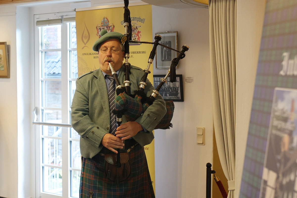 So ließ es sich der Gründer der Clan Campbell Society Germany, einem deutschen Ableger des schottischen Clans Campbell im Distrikt Argyll, nicht nehmen, den Gästen zunächst einen guten schottischen Whisky zu reichen. Außerdem begrüßte sein Freund und Dudelsackspieler Axel Römer die Gäste musikalisch.