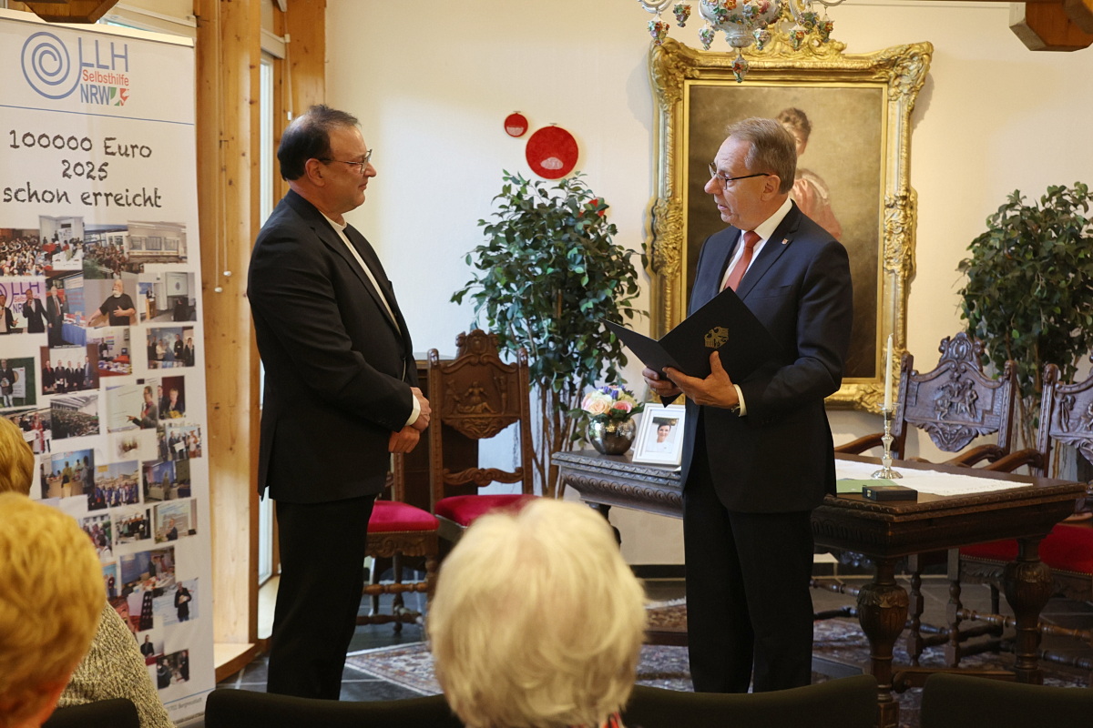 Es war ein ungewöhnlicher Einstieg in die Feierstunde im Bergneustädter Heimatmuseum, bei der Michael Enders das Bundesverdienstkreuz für seine Verdienste um die Leukämie- und Lymphom-Hilfe NRW (LLH NRW) verliehen wurde.