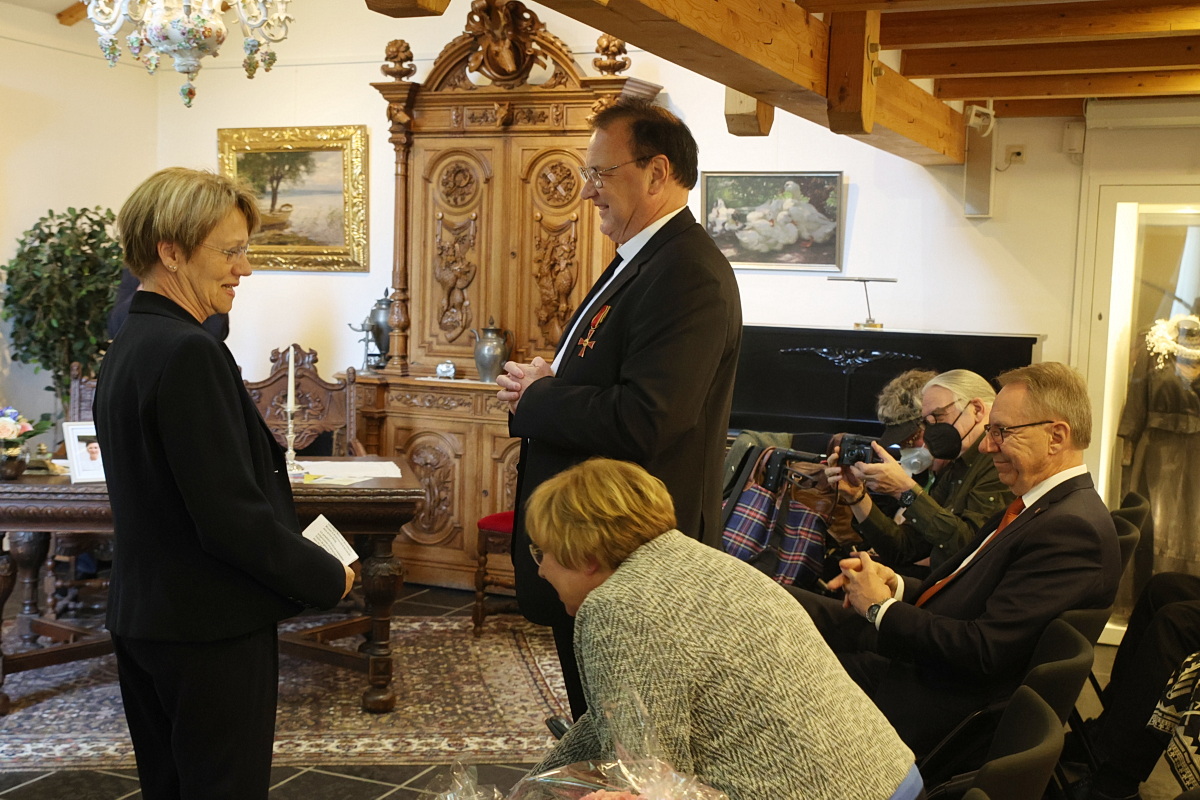 „Ich habe schon einige Bundesverdienstkreuze übergeben dürfen, und das ist immer ein bisschen anders“, bemerkte Landrat Jochen Hagt. „Aber eins haben sie immer gemeinsam: Es wird relativ abstrakt beschrieben, welche Verdienste die- oder derjenige hat. Insofern finde ich es besonders bemerkenswert, dass hier heute nicht nur diese abstrakte Würdigung zur Sprache kommt, sondern am richtigen Leben geschildert wird, was das konkret heißt. Ich glaube, das war eine sehr eindrucksvolle Darstellung.“