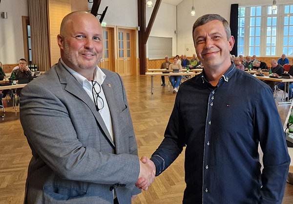 [Foto: Peter Notbohm --- Bürgermeister Matthias Thul begrüßt das neueste Ratsmitglied Leonid Donst (r.).]