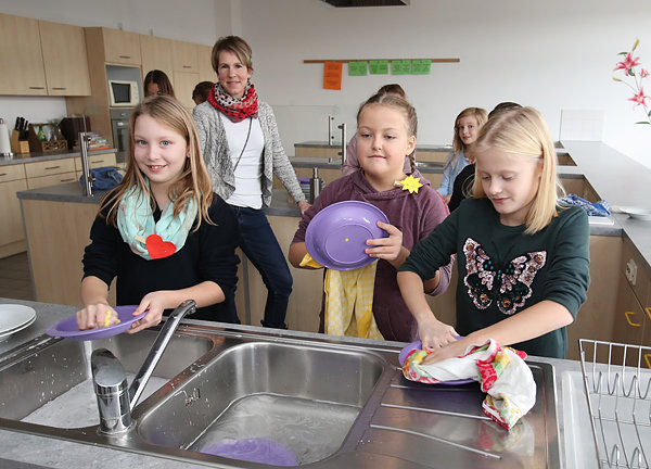 [Nach dem Kochen und Essen wird gespült - auch das lernt man in Hauswirtschaft.]