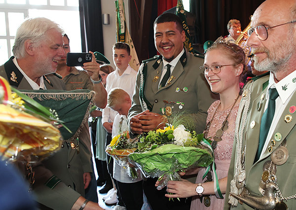[Jens-Holger Pütz, 1. Vorsitzender des Schützenvereins (li.), gratuliert Prinzessin Marit Gönner.]