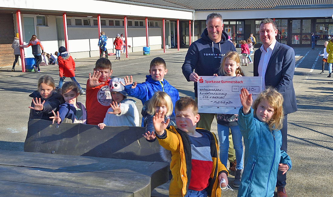 Realisiert werden konnte dies, weil die Sparkasse Gummersbach abermals die Hälfte der Projektkosten übernahm und dem Förderverein der Schule hierfür eine Spende in Höhe von 1.520 Euro zukommen ließ. Jörg Eisner, Leiter der Wiedenester Geschäftsstelle der Sparkasse Gummersbach übergab den Spendenscheck an Schülersprecherin Mila (Klasse 3a) und Schulleiter Matthias Greven.