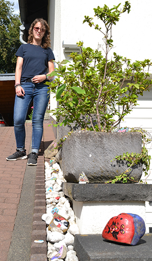 Ein wahre Steintauschbörse hat sich nun bei Familie Berg aus Bergneustadt gebildet - und das mehr zufällig als geplant. Tochter Josi Berg (Bild) bemalte ihrem Vater zum Geburtstag einen Stein, der den neuen Koi im Familienteich zeigte. So war ihre Leidenschaft geboren und in kurzer Zeit war eine ganze Sammlung selbst bemalter Steine im Beet des Vorgartens zu finden.