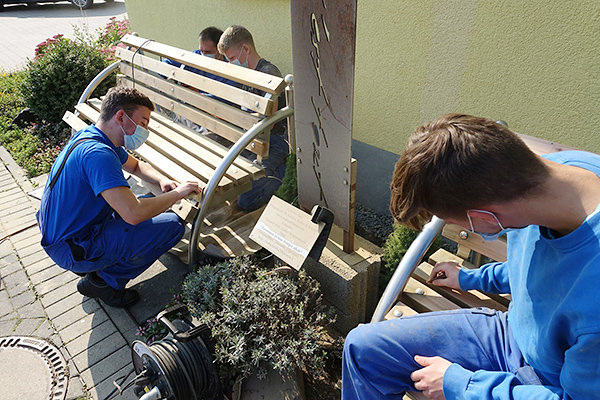 „Wir fühlen uns natürlich verantwortlich für die Produkte, die wir für die Stadt gebaut haben und möchten diese auch langfristig erhalten“, meinte Ausbildungsleiter Joachim Kühlem. Eine der Aufgaben sei, die Bänke regelmäßig zu streichen. „Mir gefällt es sehr in der Firma und ich freue mich darauf, mich an diesem Projekt ehrenamtlich zu beteiligen“, sagte Tobias Peterson, einer der vier Azubis im ersten Lehrjahr, die die Aufgabe von ihren Vorgängern übernommen haben.
